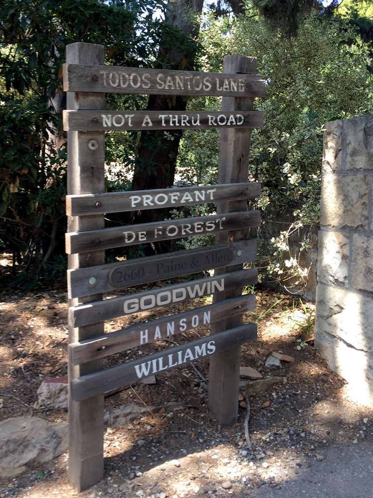 After picking up Carmaig in Pacific Palisades, we drove up PCH, making our way to Santa Barbara to fetch Kellam. Before heading to Ojai, we took a detour to the de Forest property on Todos Santos Lane.  < Click on that link -- it's historical info about the property.