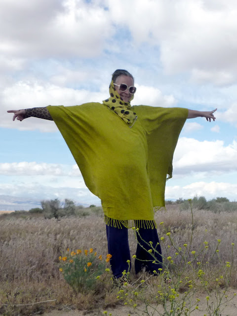 You CAN see the DIY poncho that I made by cutting a hole in the middle of a throw blanket.